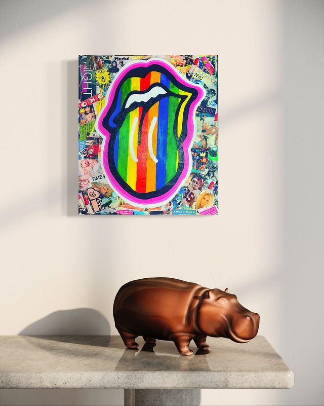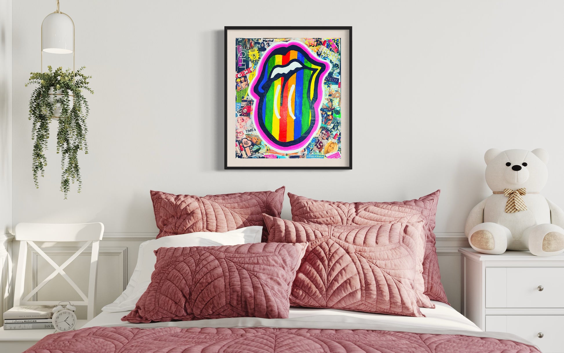 This explosive mixed-media piece takes the iconic rock symbol and transforms it into a global Pop Art statement. The rainbow tongue, outlined in electric pink and set against a backdrop of urban collage, captures the frenetic visual noise and artistic intensity of Miami, where my Pop Art style was truly refined. The bold, dripping colors recall the visceral natural beauty of the Costa Rican jungles, while the layered, overlapping images reflect the dense cultural saturation of cities like Tokyo and Rome. This artwork is a celebration of influence—mixing high-gloss fashion, rock & roll rebellion, and the vibrant, untamed energy of a life lived traveling, proving that a true icon can transcend any border or background.